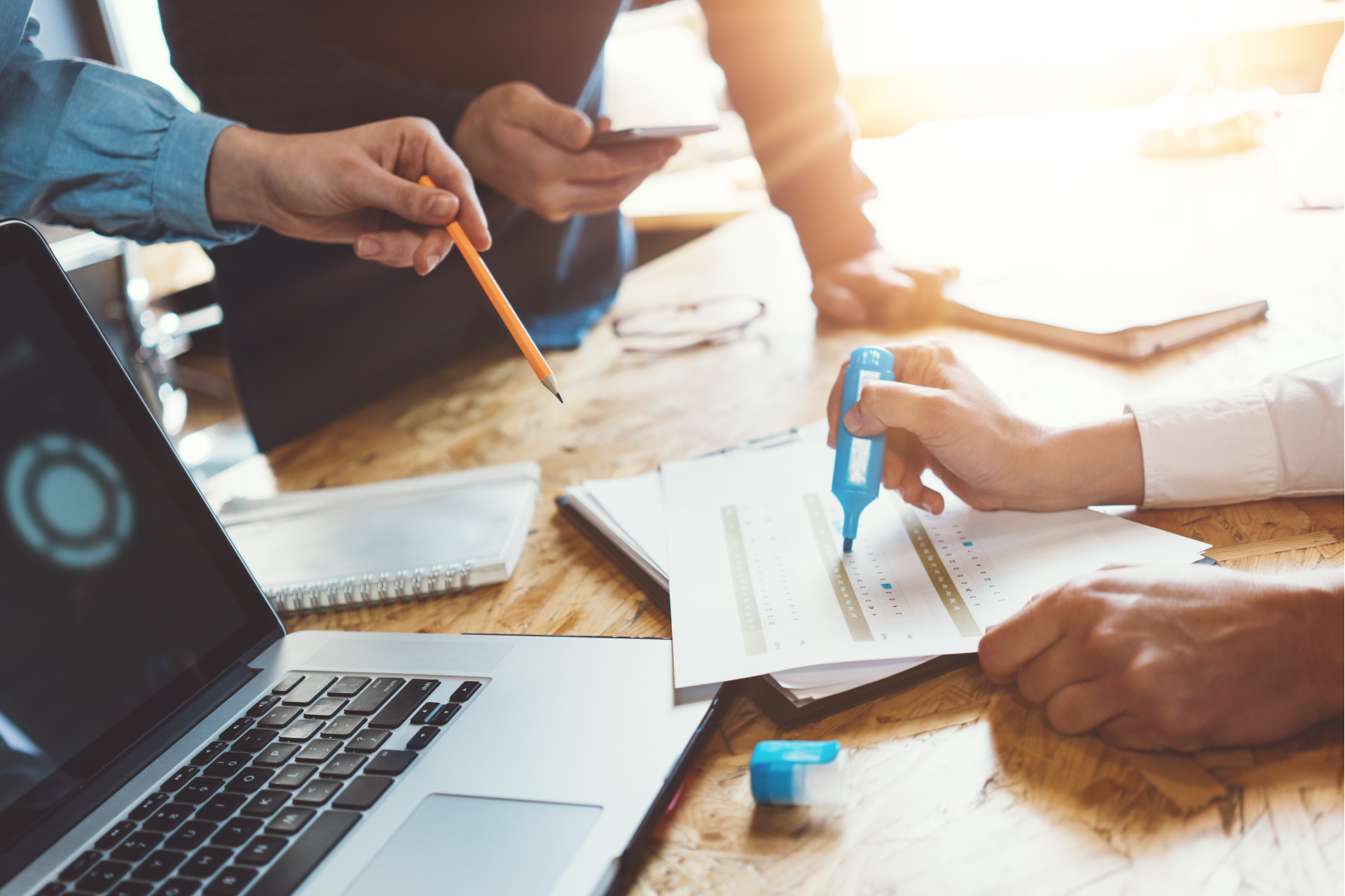 Reunião de apreciação de estudo financeiro com simulação das melhores opcões.